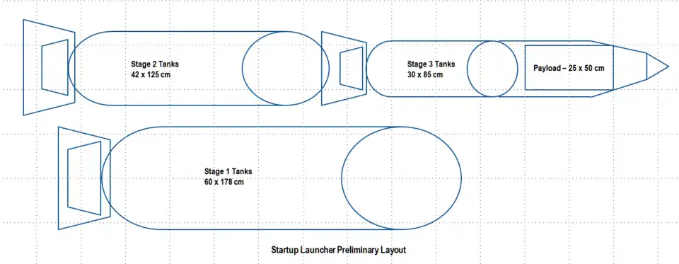 - Rocket stage tanks can share a common wall between fuel and oxidizer if they are fully sealed, and usually use an ellipsoidal dome with a 70% height ratio to minimize structural mass. We assume the payload has a density of 1 kg/liter, and thus requires 20 liters volume. For aerodynamic and structural reasons we want to keep the total vehicle height at 10 times the base diameter or less. Each combined stage tank can be modeled as two ellipsoidal domes plus a cylinder. Applying some geometry results in tank diameters of 60, 42, and 30 cm.