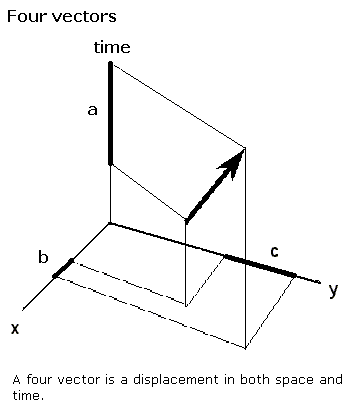 Another example of a four-vector is simply the position vector in spacetime, , or in three space dimensions. The multiplies the timelike component in this case, because that is what is needed to give it the same dimensions as the spacelike component.