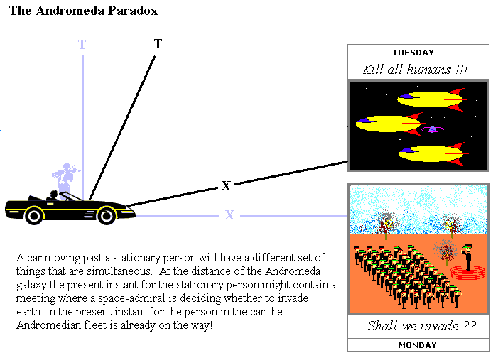 "Two people pass each other on the street; and according to one of the two people, an Andromedean space fleet has already set off on its journey, while to the other, the decision as to whether or not the journey will actually take place has not yet been made. How can there still be some uncertainty as to the outcome of that decision? If to either person the decision has already been made, then surely there cannot be any uncertainty. The launching of the space fleet is an inevitability." (Penrose 1989).