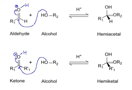 Hemiacetals and hemiaketals are formed under acidic conditions when an aldehyde or ketone reacts with an alcohol, respectively. The acidic condition protonates the carbonyl carbon on the aldehyde or ketone, followed by a nucleophilic attack of the hydroxyl group on the alcohol on the carbonyl carbon (electrophile). In monosaccharides, their physical structure can exist either as an open chain or a cyclized ring. The ring structure is more energetically stable and is more common in the case of glucose, fructose and ribose. There are two possible ring formations for these sugars, known as pyranose and furanose formations. Pyranose rings are formed from aldoses (aldehyde sugars) and furanose rings are formed from ketoses (ketone sugars). Pyranoses are 6 membered rings that resemble the structure of a pyran, whereas furanoses are 5 membered rings that resemble a furan. In hexoses, for example, the C-5 hydroxyl group acts as the alcohol (nucleophile) that attacks the C-1 aldehyde carbonyl carbon (electrophile). This results in an intramolecular hemiacetal at the C-1 position. To form a intramolecular hemiaketal, the C-5 hydroxyl group of a ketohexose attacks the C-2 keto group to form the 5 membered ring, furanose.