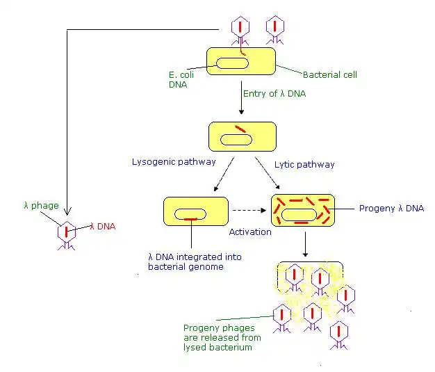During the lysogenic pathway, a lambda phage containing virus DNA attaches itself onto a host bacterium cell containing a plasmid. The lambda phage releases into the host cell where it is integrated into the host's genome. The phage DNA is then incorporated into the host chromosome and is replicated along with the rest of the host's DNA and remains inactive. This can continue for several generations until environmental factors activate the expression of the dormant phage DNA. The progeny DNA is then released from the host genome and is enclosed into virus packages. The bacterium then lyses and releases the progeny virus particles also called virions.