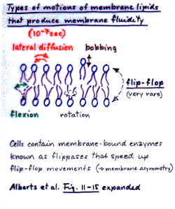 Because cell membrances are held together by hydrophobic interactions, which are weak enough to permit unlinking, cell membranes are not static sheets of lipid molecules. Membrane lipids are able to shift laterally, that is, they can move in the plane of the membrane. However, transverse diffusion across a membrane, or flip-flop, happens rarely because the energy barrier to switch one lipid molecule from one phospholipid layer to the other is too high since the hydrophilic head of the lipid molecule has to cross the hydrophobic core of the membrane. Flippases, a family of protein, help in the flip flop interactions of the phospholipids by catylyzing the reaction, making it faster and more energy favorable.