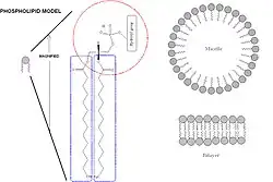 A phospholipid molecule consists of two main parts, a hydrophilic polar head group and a hydrophobic tail. The polar head group has one or more phosphate groups while the hydrophobic tail has two fatty acyl chains. The polar head group is joined to the hydrophobic moiety by a phosphodiester linkage via a glycerol or sphingosine molecule. When these molecules are placed in water, the head group faces water while the tail faces away from water, making a bilayer. The fatty acyl chains consists of entirely hydrocarbons. If the carbon atoms are all bonded by single bonds, then it is saturated. If one or more double bond exist, it is unsaturated. The fatty acid chains provide the hydrophobic barrier.