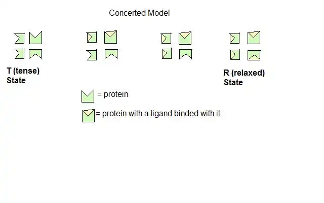 There are two models that describe and give explanation of the cooperativity binding of ligands. The first model is the concerted model (MWC model) states that there are only two possible forms in which protein can exist. It is either T (tense) or R (relaxed) state. The process of the addition of ligands shifts the protein from T state to R state. In the example of the hemoglobin protein, the deoxy form is in T state, but the addition of the oxygen ligands to the active sites of the protein, transfers hemoglobin into the oxy form which corresponds to the R state.