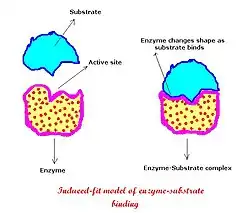 Induced fit indicates a continuous change in the conformation and shape of an enzyme in response to substrate binding. This makes the enzyme catalytic which results in the lowering of the activation energy barrier causing an increase in the overall rate of the reaction. In other words, when a substrate binds to an enzyme, it will change the conformation of the enzyme. This forms a transitional intermediate which lowers the activation energy and allows the reactants to proceed towards the product at a faster rate. In the case of macromolecules (e.g. proteins), induced fit shows the changes in the shape of a macromolecule in response to a ligand binding so that the binding site of macromolecule conforms more efficiently to the shape of the ligand. The enzyme will change its shape until it is completely complementary to a substrate to activate the enzyme-substrate complex.