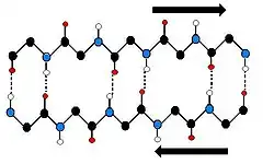 The parallel arrangement occurs when neighboring polypeptide chains run in the same direction, meaning the N and C terminals of the peptide chains align. As a result, an amino acid cannot bond directly to the complementary amino acid in an adjacent chain as in the anti-parallel configuration. Instead, the amino group from one chain is bonded to a carbonyl group on the adjacent chain. The carbonyl group from the initial chain then hydrogen bonds to an amino group two residues ahead on the adjacent chain. The distortion of the hydrogen bonds in the parallel configuration affects the strength of the hydrogen bond because hydrogen bonds are strongest when they are planar. Therefore, due to this distortion of hydrogen bonds, parallel beta sheets are not as stable as anti-parallel beta sheet (exp: formation of parallel beta sheet with less than 5 residues is very uncommon).