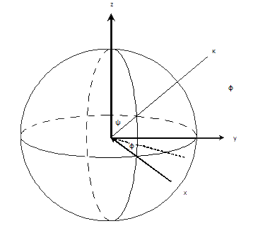 To find the orientation, determine the rotation axis and rotation angle about that axis. Two parameters will be needed to define an axis (a vector from the center of the sphere to a point on the sphere surface). The rotation axis starts off parallel to the z-axis and is rotated around the y-axis with angle ᶱ, then the object rotates around the z-axis with angle ᶲ, and finally it rotates around the rotation axis with angle ᵠ. These specify a point on the surface of a unit sphere.