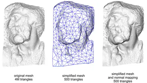 • The Polygon mesh (or just mesh), which is a 3D wire_frame model of the surfact or visible parts of the modeled object. The mesh is usually comprised of many faces, or polygons, the most common being of triangles, for any larger polygon can be mathematically broken into triangles.