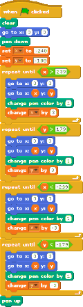 Once the free software is downloaded, a first-time user will open Scratch and find a Scratch sprite displayed at the lower right of the screen. This is a default character for the action that will be programmed and this sprite can be exchanged for any number of other images or even a random, surprise sprite. Likewise the default background for the action, or background stage, can be substituted with another image. The area for program code itself can be found to the far left and this is created by dragging preset "blocks" or instructions over to this work area and allowing them to "lock" into place, one above another, creating the script for the sprite. Within the interlocking blocks themselves any of the numeric variables can be easily changed to repeat an action a number of times for example, or to alter the position of the main sprite on the screen using the x and y axis.