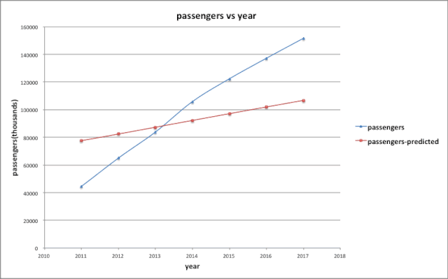 When K has a value of 177000, R-squared has a maximum value. However, from the generated S-curve, there is a big difference between the predicted passenger carrying capacity and the actual passenger carrying capacity trend. This result may have the following reasons: