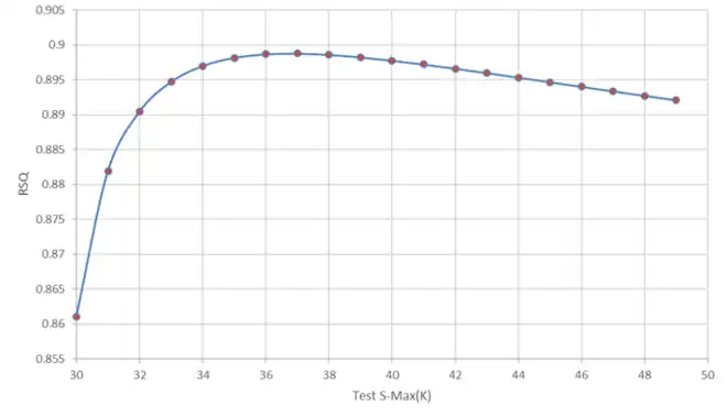 When modelling the regression of track length, it is supposed to test the S-max value. It is noticeable that when the K is equal to 37, there is the highest R-square. This indicates that it modle has the best of goodness fit when the saturation status is estimated as 80 miles, as illustrated in Figure below: