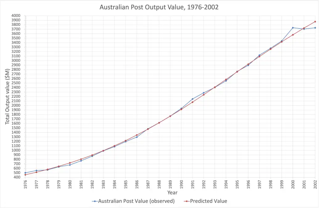 | Year | Australia Post's observed aggregate output data - Value ($M) | Australia Post's predicted aggregate output data - Value ($M) |
