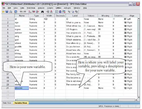 In our example, seven variables are added to create the new scale: abscale. To do this we have only to add the abortion variables, as shown above. Once you're done, click “OK.” Your new variable will then appear in the Data Editor under the “Variable View,” on the ultimate row.