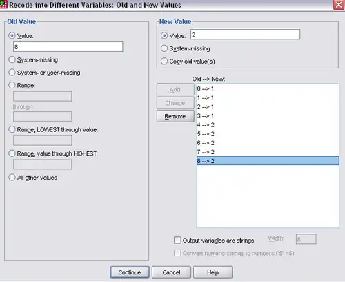For each row of our table at top, enter Old Values on the left, New Values on the right and click “Add”. That will put them into the “Old → New” list. As you can see, our screenshot shows original values 0 through 3 have been recoded as “1.” Values 4 through 8 have been recoded as “2” in the new variable. These recodings could have also been specified as ranges, by selecting the radio button next to “Range” and entering a range of source values.