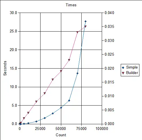 lLen is the length of the string. If you look at the table of execution times below you can see that for values of Count up to about 100 the simple method is faster but hat above that the time for simple concatenation increases roughly exponentially whereas that for the string builder increases roughly linearly (tested in the IDE, 1.8GHz CPU, 1GB ram). The actual times will be different on your machine but the general trend should be the same.