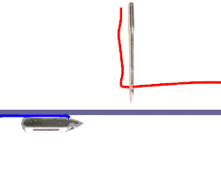 Same as the chain stitch, the needle lowers, pulls a loop of thread of string through the fabric, needle rises as the fabric gets pulled along by the feed dog mechanism but instead of joining the two loops together, it joins them to the bobbin's thread of string.[2][5]