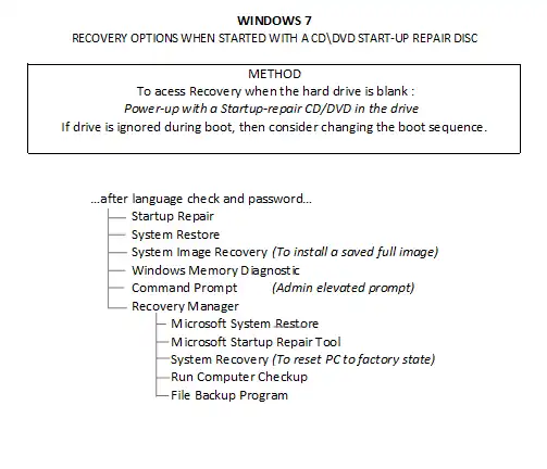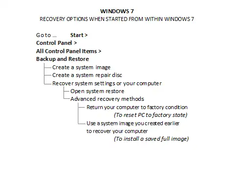 - The second drop-box, Specific Recovery Options for Windows 7 displays facilities, the details of which have been arranged in a tree format that show the route to any function from the starting point. Three sections were necessary; one for starting within Windows, another for the f8 start during bootup, and one where a startup-repair disc is required.