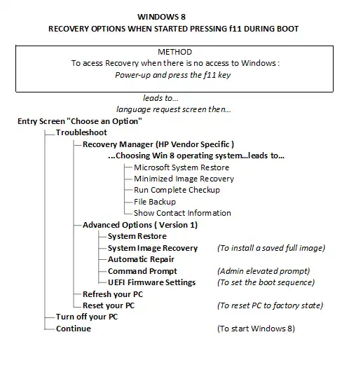 - The third drop-box's layout, Specific Recovery Options for Windows 8 takes the same approach as for that of Windows 7. In fact there are more methods shown than for Windows 7. and the three listings here are also in tree format. Notice the change to f11 for the key boot-up, but see the notes in the section below for the use of f8. If laptop viewing of such detail becomes difficult, just click the box contents to view the images in full scale. Use f8 starts in Windows 8.