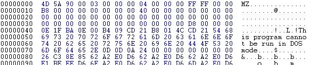 After the File ID, the hex editor will show several bytes of either random-looking symbols, or whitespace, before the human-readable string "This program cannot be run in DOS mode".