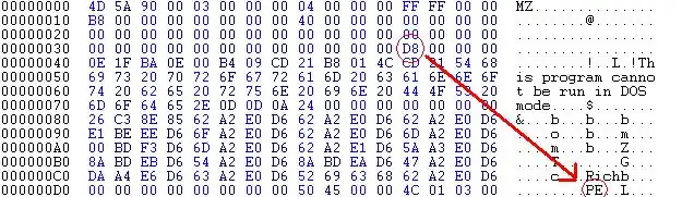 Hex Listing of a PE signature, and the pointer to it
