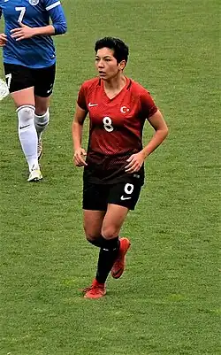 Çağla Korkmaz (born November 14, 1990) is a Turkish-German female football forward currently playing in the German 2. Bundesliga for 1. FC Lübars with jersey number 8. She is a member of the Turkey women's team.[1]