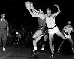 Furlong (#8) fights for control of the ball, at the 1950 FIBA World Championship.