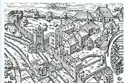 On the so-called Murerplan map of 1576, the central Lindenhof–Sihlbühl hill area is illustrated, surrounded by the Limmat river – at the top, in fact in the east and not in the north – the Fröschengraben and Schanzengraben moat to the right, and some meandering streams of the Sihl river to the right. There are also shown the watermills,[1] provided by the nunneries in Zürich at the location of the present Rathausbrücke and southernly Münsterbrücke and former Gedecktes Brüggli bridges over the Limmat river, an old privilege dating back to the foundation of the Fraumünster abbey located at the present Münsterhof square.