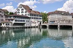 The so-called Gedecktes Brüggli served as a pedestrian bridge, was very popular, but was broken in 1950.[6] As its Swiss-German name explains, it was a covered wooden bridge that was created by architect Vögtlin over an arm of the Limmat river in 1689. Measuring about 17.5 metres in length, it connected the lower Mühlesteg and Papierwerd between present Limmatquai and Bahnhofquai nearby Bahnhofbrücke Zürich. At the site of the then-mill lower ridge at Papierwerd – a former river island that later was used as the site of a paper mill – today's Mühlesteg pedestrian bridge was erected.