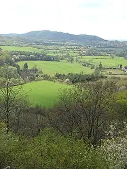 Úhošť is located in the Doupov Mountains in the municipal territory of Kadaň, between the villages Brodce and Pokutice (parts of Kadaň). The hill is a mesa with an area of 114.5 ha (283 acres); the plateau at the top has an area of 80.5 ha (199 acres).[2] It has been protected as a national nature reserve since 1974. The national nature reserve has an area of 344.9 ha (852 acres) and a negligible area of the reserve lies also in the territory of Klášterec nad Ohří.[1]