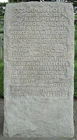 It is unknown exactly how many prisoners died in Überlingen. A minimum number of 170 is known because of 2 burials at the Überlingen cemetery, 71 bodies that were cremated in Constance, and 97 bodies that were found after the war in a mass grave in the Degenhardt Forest, southeast of the village of Andelshofen.[3][4] A memorial at the location commemorates the dead prisoners with the following inscription: