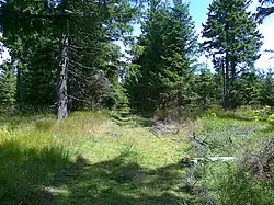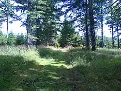 No marked tourist trail leads to the main summit,[2] which is near the main ridge road (marked by two horizontal white stripes on tree trunks) connecting both the main and secondary summits. It is located in a spruce forest area, covered with alpine grass.[5] Due to the forestation, it does not offer scenic viewpoints. At the summit, there is a triangulation station marked on geodetic maps as number 15.1, with an elevation of 1,103.0 m above sea level and coordinates 50°10′45.78″N 17°04′43.70″E / 50.1793833°N 17.0788056°E / 50.1793833; 17.0788056.[5] Additionally, about 20 m southwest of the summit, there is another triangulation station, marked as number 15.2, with an elevation of 1,102.6 m above sea level and coordinates 50°10′45.47″N 17°04′42.76″E / 50.1792972°N 17.0785444°E / 50.1792972; 17.0785444.[5]