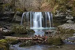 There is an abandoned Peračica tuff quarry in the foothills immediately north of Črnivec.[3] Peračica Falls (Slovene: slap Peračica or Peračiški slap) is located along Peračica Creek on the northern edge of the village's territory.[4] It is a 5-meter (16 ft) waterfall flowing over andesitic tuff.[5]