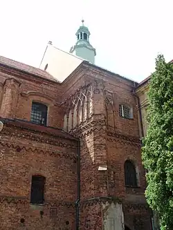 Łask was founded in the 11th century, and from the 14th century it was the seat of the powerful Łaski noble family.[3] Korab, the family's coat of arms, remains the town's coat of arms to this day. The first mention of Łask comes from 1356. A church was built in 1366, and in 1498 Polish prince and Primate of Poland Frederick Jagiellon founded a hospital for the poor.[4] In 1422 it was granted town rights modeled on Środa Śląska by virtue of a document issued by Polish king Władysław II Jagiełło in Mielno.[3] The king also set up an annual fair and a weekly market.[3] In 1504, King Alexander Jagiellon confirmed and extended the privileges.[5] Crafts soon developed and in 1517–1523, the town's landmark Gothic collegiate church was erected under the patronage of the Primate of Poland Jan Łaski.[3] It was partially rebuilt in Baroque style in the 18th century.[3] Thanks to the efforts of Hieronymus Łaski, King Sigismund III Vasa granted four new fairs in 1613.[5] After the Łaski family, from 1660 until the Partitions of Poland the town was owned by the Nadolski, Wierzbowski and Załuski families.[3] Łask was a private town, administratively located in the Szadek County in the Sieradz Voivodeship in the Greater Poland Province of the Kingdom of Poland.[6]