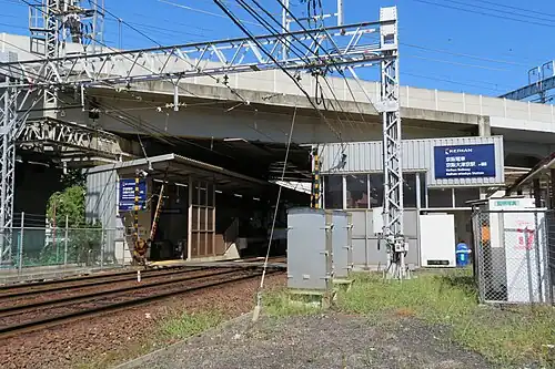 Keihan-otsukyo Station (京阪大津京駅, Keihan-Ōtsukyō-eki)is a passenger railway station located in the city of Ōtsu, Shiga Prefecture, Japan, operated by the private railway company Keihan Electric Railway. The station is located underneath the elevated tracks of the Kosei Line of West Japan Railway Company, and passenger interchange is possible with JR West Ōtsukyō Station, although the stations are not physically connected.