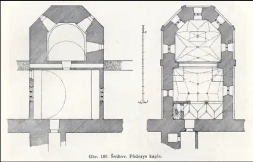 The castle's chapel was built between 1480 and 1489 by Půta von Schwihau The exterior of the chapel remained mostly undamaged, the interior in the other hand was until its reconstruction in 1890. The stairs leading to the chapel were destroyed as well. The entrance hall has a net vault, it's ribs lean onto decorated consoles and converge into one paint keystone. The nave of the chapel is also vaulted, but all four ribs were rough-hewed for unknown reasons.