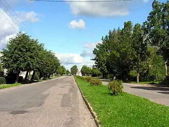 Birdview of Židikai main street Museum of Šatrijos Ragana Monument of Independence Gymnasium of Marija Pečkauskaitė | |