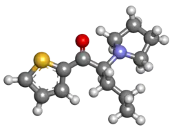 α-Pyrrolidinopentiothiophenone (also known as α-PVT) is a synthetic stimulant of the cathinone and thiopropamine (thiophenylpropylamine) families that has been sold online as a designer drug.[1][2][3] It is an analogue of α-PVP where the phenyl ring has been replaced by thiophene.