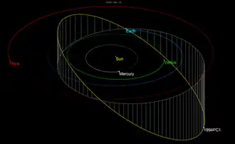 1994 PC1 orbits the Sun at a distance of 0.9–1.8 AU once every 1 years and 7 months (572 days). Its orbit has an eccentricity of 0.33 and an inclination of 33° with respect to the ecliptic.[1]