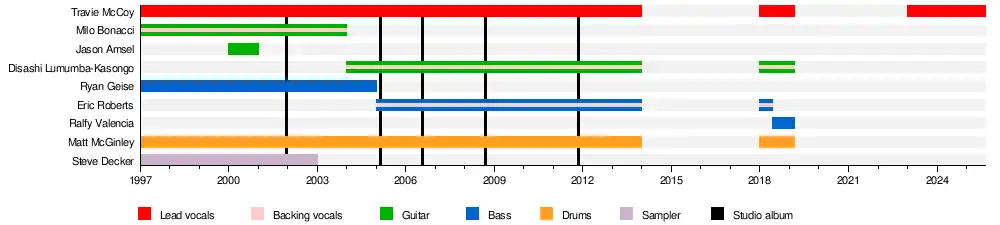 Rapper Travie McCoy and drummer Matt McGinley became friends at their local high school in ninth grade in Geneva, New York.[2] They officially came together in 1997.[3] The band formed when bassist Ryan Geise and drummer Matt McGinley were performing at a party in an instrumental band with no vocals. McCoy, who was in attendance at the party, took the microphone onstage and started rapping.[4] A week later, the group came together and started making music.