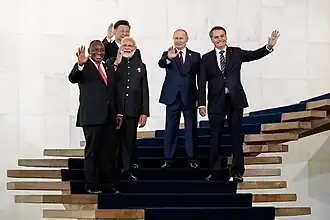 The 2019 BRICS summit was the eleventh annual BRICS summit, an international relations conference to be attended by the heads of state or heads of government of the five member states Brazil, Russia, India, China and South Africa. The meeting was held at the Itamaraty Palace, where the Brazilian Ministry of Foreign Affairs is located.[2] The Brazilian capital hosted the BRICS summit for the second time. The Sherpa meeting was held in the Brazilian city of Curitiba between March 14 and 15.[3]