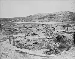 The Allies launched a coordinated series of offensives on 26–29 September. Second Army's attack (the Fifth Battle of Ypres) began on 28 September. The attack was a surprise, with no preliminary bombardment, but the assaulting troops were preceded by a dense creeping barrage. Despite the acknowledged weakness of 14th (L) Division, it had been given one of the toughest objectives: 'The Bluff'. This spoil heap from the construction of the canal had been fought over and undermined since early 1915: in the words of the Official History it 'bristled with machine guns and was expected to prove troublesome'.[b] 43rd Brigade attacked along the canal, with 12th Suffolks on the north bank, 20th Middlesex on the south, and 10th HLI in reserve. The Suffolks attacked with two companies in front formed up along 'Middlesex Road' and two 400 yards (370 m) behind in support, each company in two waves formed of lines of 'worms' (sections in single file[85]). From Middlesex Road the ground rose gently but was deeply pitted with shellholes, overgrown with woods and broken wire, making for bad going. The elongated 'Spoil Bank' along the canal bank was also covered with shellholes, leading to a dip and then the steep 50–70 feet (15–21 m) face of the Bluff. Although the men were of low medical category they were keen and confident and moved across the ground smartly, keeping close to the barrage. A Company took on the Bluff frontally, one platoon moving along the top of the Spoil Bank (with a patrol on the canal bank) the other below, while B Company swept round the flank of the Bluff. Although the defenders at first showed signs of resistance, they lost heart when they saw the flanking movement and gave way. The battalion took 150–200 prisoners, a field gun and numerous machine guns, trench mortars and anti-tank rifles, and a complete dressing station, at the cost of 122 casualties. A detachment of 184th Tunnelling Company, RE, checked the 14 known tunnels and dugouts under the Bluff, disarming at least four that were charged with explosives. After 12th Suffolks had secured the Bluff, 20th Middlesex on the other side of the canal could pass it and go on to their objective of 'White Chateau' without much opposition. 43rd Brigade having completed its task, other formations continued the battle. Lieutenant-Col Lloyd received a rare second Bar to his DSO for his work.[79][80][81][82][86][84][87]