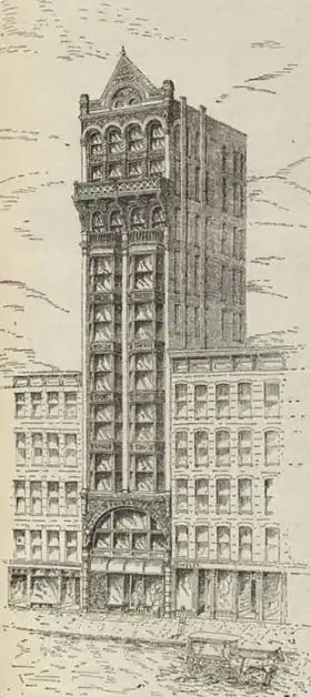 At the end of the 19th and beginning of the 20th centuries, the area around Maiden Lane and John Street became home to a number of early skyscrapers built speculatively to house businesses attracted to the booming financial district, which was expanding north.[2] Maiden Lane was already established as the center of the city's jewelry district as early as 1795, and the area near Broadway was a busy shopping district.[3] In 1892, Manhattan real-estate developers Abraham Boehm and Lewis Coon announced that they had acquired the property at 14 Maiden Lane and intended to demolish the existing structure, replacing it with a ten-story tower specifically intended for the diamond trade.[4] At the time, the planned building would be among the tallest in the city, as elevators and new building techniques permitted ever higher construction and the city's rapid growth created an insatiable real-estate market.[1]