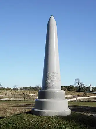 The 13th, 14th and 16th Vermont regiments played a pivotal role in the Union repulse of Pickett's Charge on the afternoon of July 3. The 13th and 16th regiments flanked James L. Kemper's brigade as it approached the copse of trees on Cemetery Ridge, then the 16th wheeled about, and joined by the 14th, stopped the advance of Cadmus M. Wilcox's brigade, capturing hundreds of Virginians. Lieutenant George Benedict, an aide to Brigadier General George J. Stannard, related General Abner Doubleday's reaction, saying he "waved his hat and shouted: 'Glory to God, glory to God! See the Vermonters go it!'"[1]