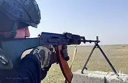 The brigade, much like other newly created mechanized brigades such as the 150th Mechanized Brigade, utilise older variants of the Kalashnikov rifle series such as the AKM and AKMS.[4] The brigade has also been seen with other Western styled small arms such as an AR-15 styled rifle in a video published by the brigade, this has been used alongside other weapons such as the PKM, and the M240B seen in the same publication by the brigade.[5] Other machine guns such as the RPK has been seen in use by the brigade.[6]