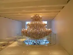 The original 1,900-piece Louis Quinze chandelier that used to hang in the main hall of J. P. Morgan's 23 Wall Street was given by Morgan to be displayed in the lobby of 15 Broad Street. According to the architect Phlippe Starck, many pieces had come from Austria-Hungary before World War I and have been identified by him as Swarovski crystal.[14] Starck made the roof of 23 Wall into a 5,000-square-foot (460 m2) garden with children's pool and dining area, accessible to the residents of the development.[14]