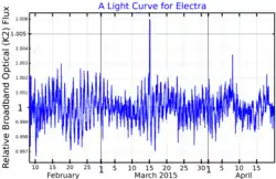 Electra may be a variable star, and it appears in the New Catalogue of Suspected Variable Stars as NSV 15755. Low amplitude variability of the brightness of Electra was detected by Kepler/K2, and Fourier analysis of the star's light curve shows several periods of oscillation, the strongest being 1.107 and 1.165 days.[17] The International Variable Star Index classifies it as a slowly pulsating B star.[18]