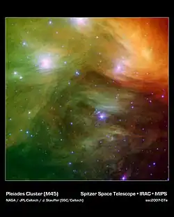 - ^ Gorlova, Nadya; Rieke, George H.; Muzerolle, James; Stauffer, John R.; Siegler, Nick; Young, Erick T.; Stansberry, John H. (October 2006). "Spitzer 24 μm Survey of Debris Disks in the Pleiades". The Astrophysical Journal. 649 (2): 1028–1042. arXiv:astro-ph/0606039. Bibcode:2006ApJ...649.1028G. doi:10.1086/506373. S2CID 17227369.