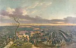 Napoleon was too quick for Blücher: he decimated Lieutenant General Olssufiev's Russian IX Corps at the Battle of Champaubert (10 February).[6] This placed his army between Blücher's vanguard and his main body.[7] Napoleon turned his attention to the vanguard and defeated Osten-Sacken and Yorck at Montmirail on 11 February;[7] and attacked and defeated them again the next day at the Battle of Château-Thierry.[8] Napoleon then turned on the main body of the Army of Silesia and on 14 February defeated Blücher in Battle of Vauchamps near Étoges, pursuing the latter towards Vertus. These disasters compelled the retreat of the whole Silesian army, and Napoleon, leaving detachments with marshals Mortier and Marmont to deal with them, hurried back to Troyes.[2]