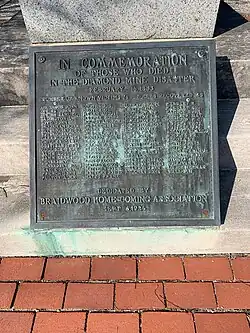 The United Mine Workers of America dedicated a monument to the victims of the Mine Disaster in 1898. The monument is located in the southeast part of the former mine on Illinois Route 113 in Diamond, Illinois just west of Coal City, Illinois. On September 6, 1926, 43 years after the disaster, the Braidwood Homecoming Committee dedicated a plaque with the names of the victims. This plaque is located at the base of the United Mine Workers Memorial.[10]