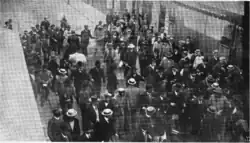 With Leguía refusing to resign, he was taken with the group out of the building while being shot at from troops in its rooftop led by Major Augusto Paz. Miguel Abraham Rojas, who had accompanied Leguía up to that point, separated from the group, while Manuel Vicente Villarán joined them shortly before leaving the Palace.[1] The small group paraded Leguía along the Jirón de la Unión until they reached Pando street, where the residences of Leguía and Augusto Durand Maldonado were located, and then changed course towards Inquisition Square, with an hour passing by until police intervened.[1]